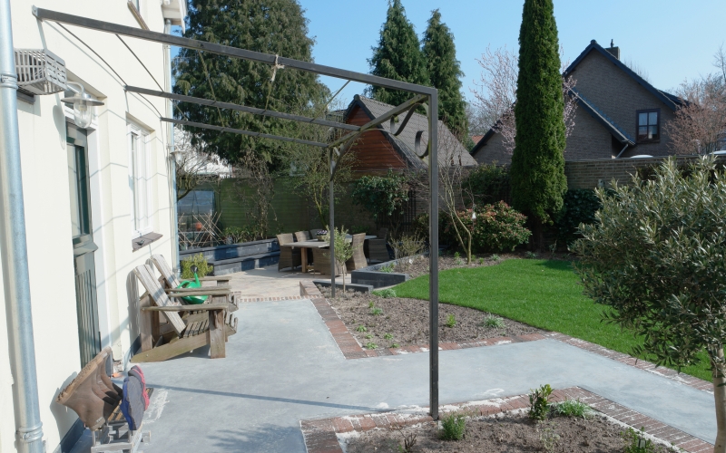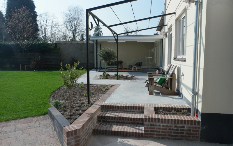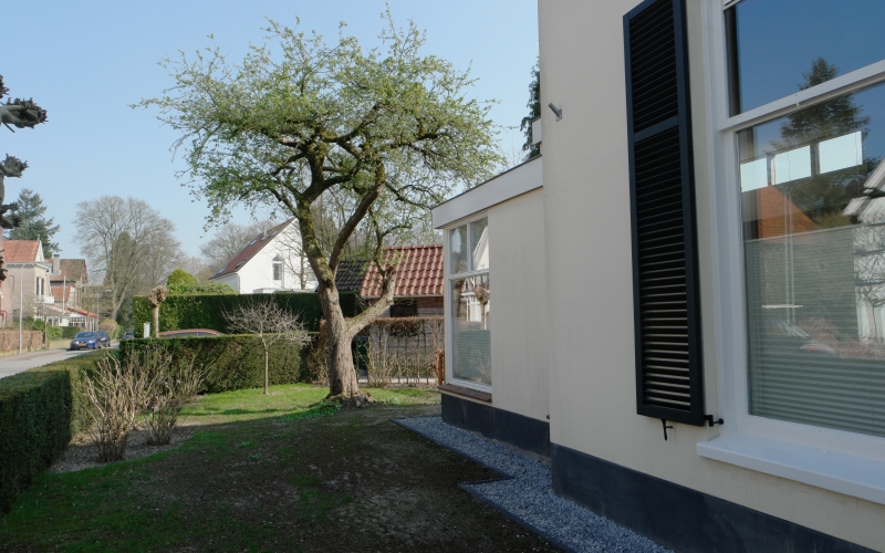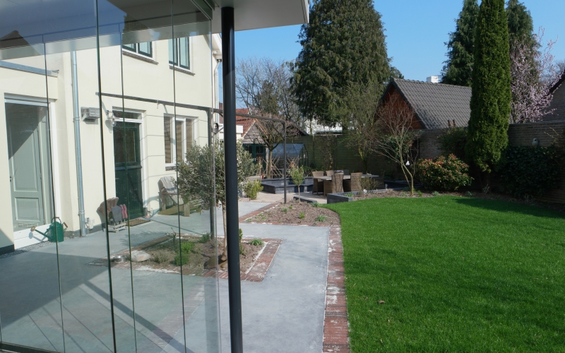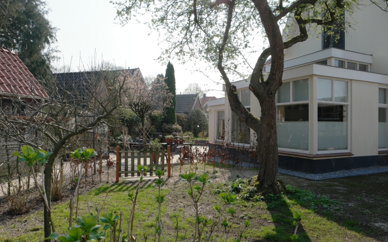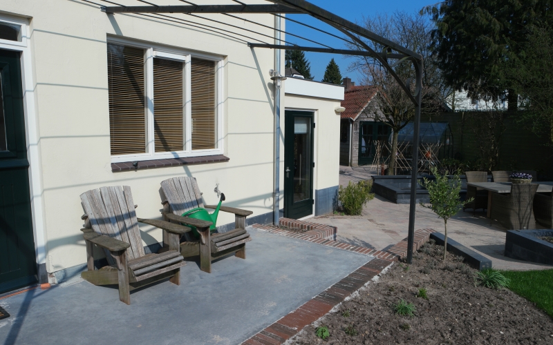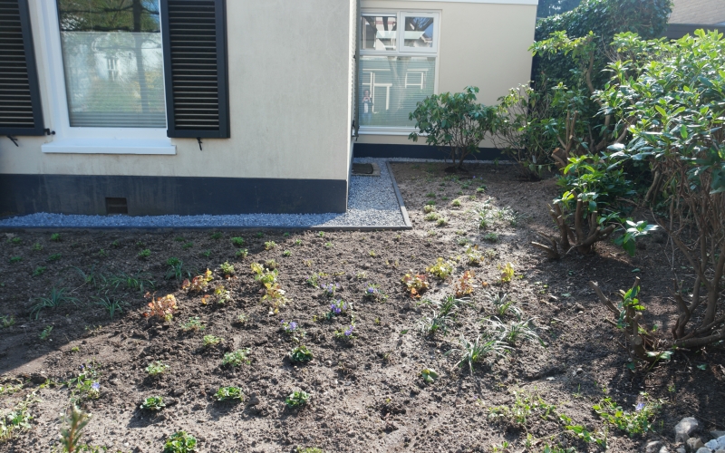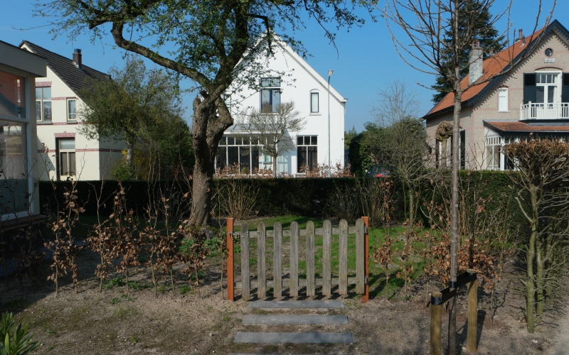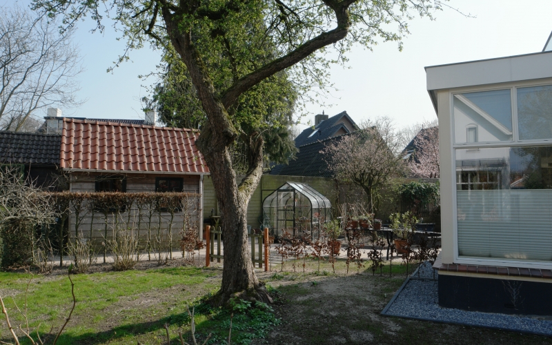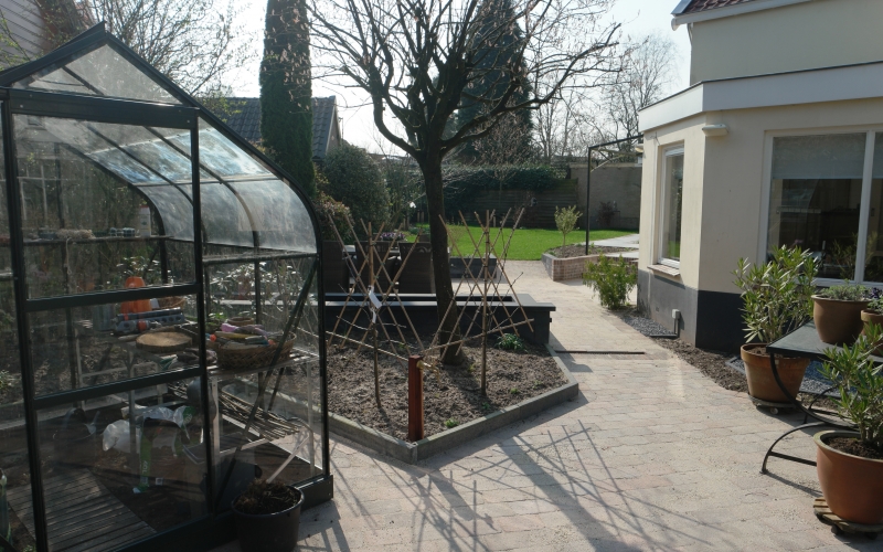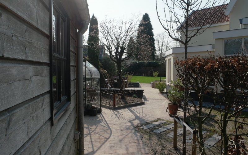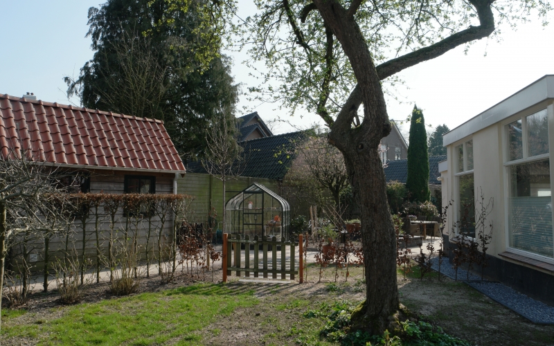 Een nieuwe tuinkamer vraagt om aanpassing van de tuin. Het perceel is circa 700 m2 groot, maar dat is nauwelijks ervaarbaar door de grote hoeveelheid beplanting. Hoewel ik niet graag bestaande beplanting weghaal, is dat hier wel gebeurd om veel mooiere ruimtes te maken. De bestaande hoogteverschillen en de verschillende richtingen op het perceel vormende de basis voor het plan. Het fraaie tuinkasje -dat op de plek van de tuinkamer stond- heeft een nieuwe plek in de tuin gekregen en wordt weer volop gebruikt. Aan de noordwestzijde van het perceel is een deel van de tuin ingeplant met een mengsel van schaduwminnende, laagblijvende, vaste planten.